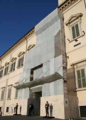 L’individuazione tecnico – scientifica delle differenti patologie chimiche e fisiche di degrado ha consentito di segnalare, su specifici elaborati grafici, gli interventi di restauro, classificati in operazioni di consolidamento, di pulizia e di protezione, e suddivisi secondo le tipologie della materia. Particolare attenzione è stata data alla realizzazione delle opere afferenti la costruzione dei ponteggi atti a garantire la praticabilità dei luoghi anche nel corso dell’esecuzione dei lavori. A tal riguardo i tecnici della  De Feo  Restauri  ha disposto ponteggi ad andito chiuso illuminati ed allarmati di cui seguono le immagini in corso d’opera e ad esecuzione finita. Sono state inoltre realizzate finiture consistenti nella tinteggiatura a finto travertino delle recinzioni in legno dei ponteggi, curando il minor impatto visivo sull’edificio. Sono state altresì realizzate pedane per i militari di guardia all’edificio in sostituzione
