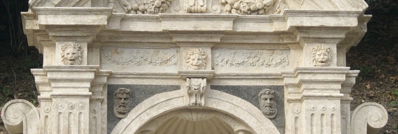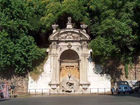 Brief historical notes. Placed so as to appear as a beautiful backdrop of via Luciano Manara, the ancient Prigione fountain, to date located in via Goffredo Mameli, was part of the monuments that adorned the famous Villa Montalto of Pope Sixtus V, demolished in 1887 for the construction of Termini Train Station . With the progressive demolition of the villa, the fountain was dismantled and provisionally set aside in the warehouses of the Ministry of the Interior. Subsequently, it was recomposed at the end of via Genova, and subsequently, in 1928, it was transferred and definitively arranged, by the Civil Engineer Comitee, in its current position, at the foot of the Janiculum. The noun “prigione”, belonging to the ancient name of the fountain, derives from a grandiose and valuable statuary group which included a marble half figure depicting a prisoner. The fountain that we admire today consists of a niche delimited by two pilasters that support the pediment rich in floral decorations and lion protomes. At the base of each pilaster two small suspended basins receive water from as many spouts, while a low ground-level basin, protected by six elegant columns, collects the fan-shaped water from a large lion head that protrudes in the center of the niche.