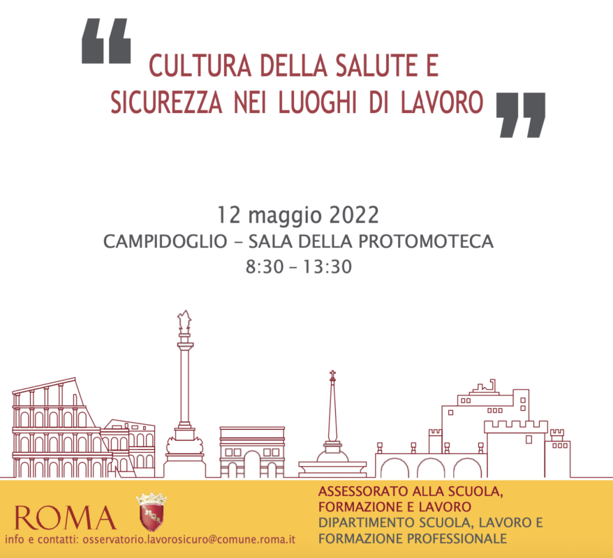 Si segnala che il 12 maggio 2022, presso il Campidoglio – Sala della Protomoteca, dalle ore 8:30 alle ore 13:30, si terrà la giornata seminariale sulla “Cultura della salute e sicurezza nei luoghi di lavoro”.