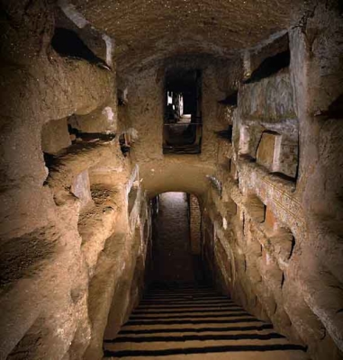 Brevi cenni storici. Tra le più grandi e importanti di Roma, furono il cimitero ufficiale della Chiesa di Roma nel III secolo. In esse trovarono sepoltura circa mezzo milioni di cristiani, tra cui decine di martiri e sedici pontefici. Prendono il nome dal diacono San Callisto che, all’inizio del III secolo, fu preposto da Papa Zeffirino all’amministrazione del cimitero. Sorsero verso la metà del secondo secolo e fanno parte di un complesso cimiteriale che occupa un’area di 15 ettari di terreno, con una rete di gallerie lunghe quasi 20 chilometri, su diversi piani, e raggiungono una profondità superiore ai 20 metri. La Cripta di Santa Cecilia, la popolare patrona della musica. Di nobile famiglia romana, fu martirizzata nel terzo secolo. Sepolta dove ora si trova la sua statua, fu qui venerata per almeno cinque secoli. La cripta era tutta decorata con affreschi e mosaici. Sulla parete vicino alla statua c’è un’antica immagine di Santa Cecilia, in atteggiamento di orante, più sotto, in una piccola nicchia è raffigurato il Salvatore, che tiene in mano il Vangelo; accanto è dipinto il papa martire Sant’Urbano. Su una parete del lucernario si vedono le figure di tre martiri: Policamo, Sebastiano e Quirino.
